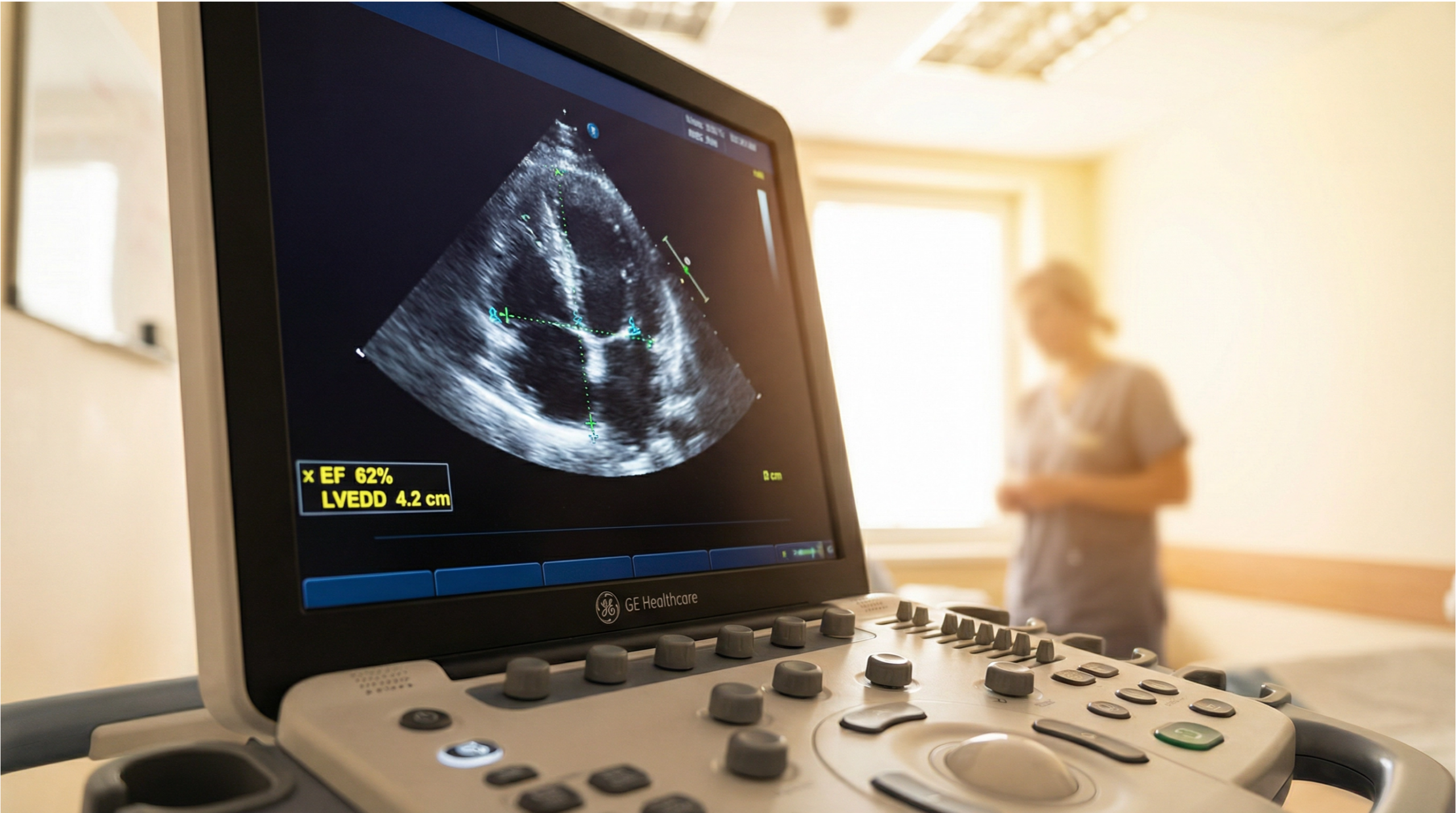 Echocardiogram monitor displaying a four-chamber heart view with ejection fraction measurement of 62 percent in a modern private ultrasound clinic